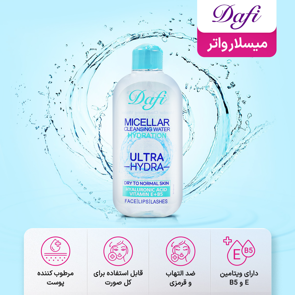 میسلار واتر دافی ویژه پوستهای خشک تا نرمال، آرایش روزانه و آلودگی را به نرمی پاک میکند و احساس طراوت میدهد. ترکیب هیالورونیک اسید و ویتامینهای E و B5 به حفظ رطوبت و تقویت سد دفاعی پوست کمک میکند و حس کشیدگی را کم میکند. بعد از پاکسازی، صورت برای ادامه مراحل مراقبت آماده است.